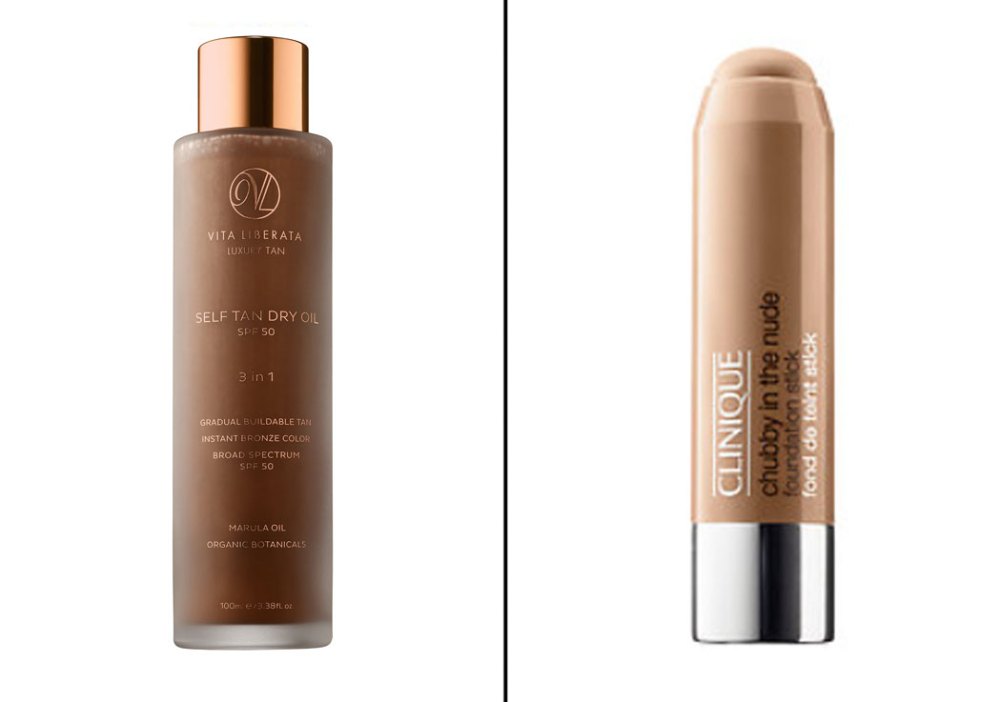 From left to right: Vita Liberata Self Tan Dry Oil ($52, sephora.com); Clinique Chubby in the Nude Foundation Stick ($24, clinique.com)