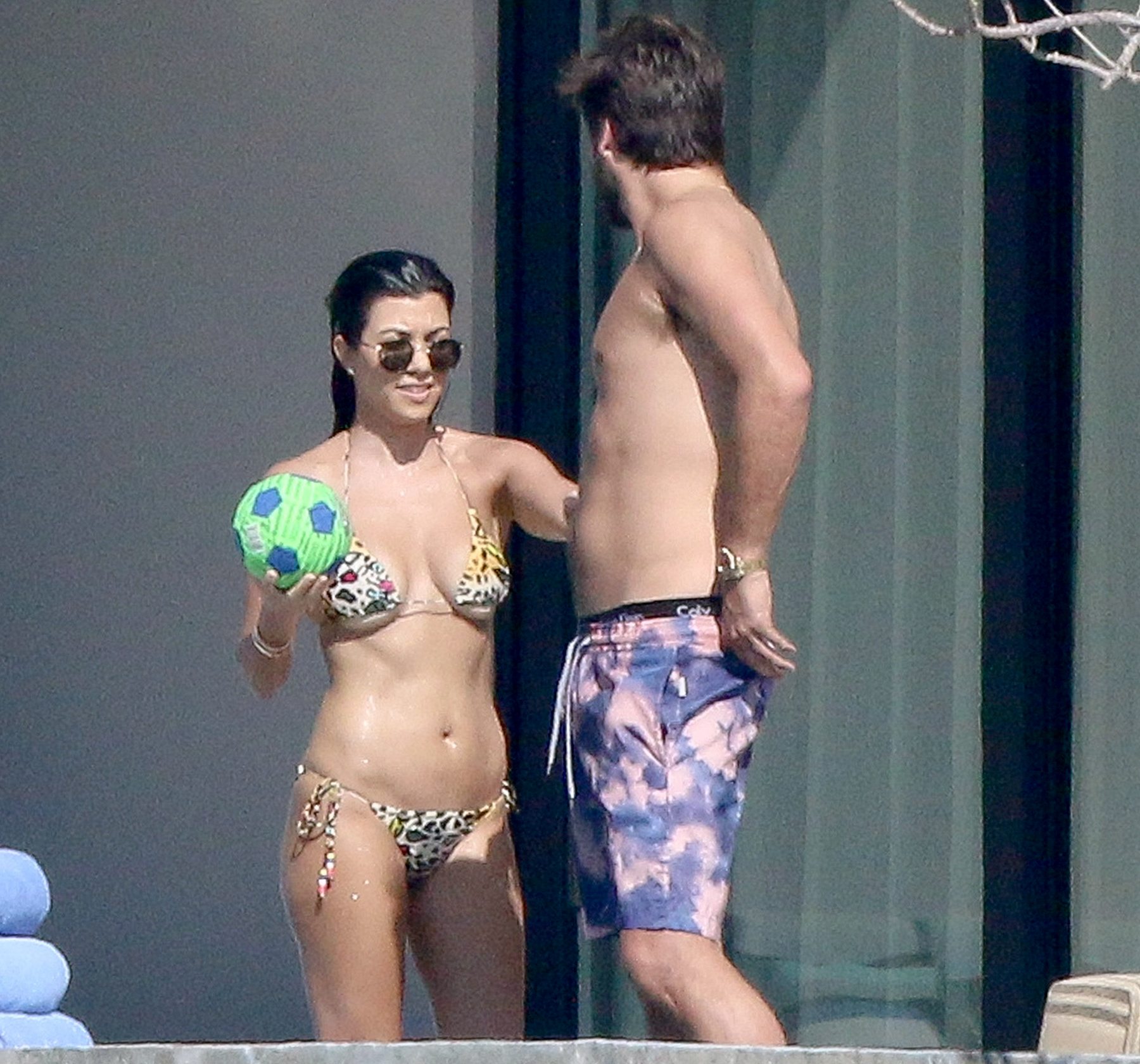 The Keeping Up With the Kardashians star, 37, was spotted hanging out by the pool with the self-proclaimed Lord Disick, 33, as they enjoyed an afternoon soaking up the sun. She showed off her fit figure in a tiny leopard-print bikini, which put her abs on full display. Disick, meanwhile, opted for a pair of blue-and-pink Onia board shorts.