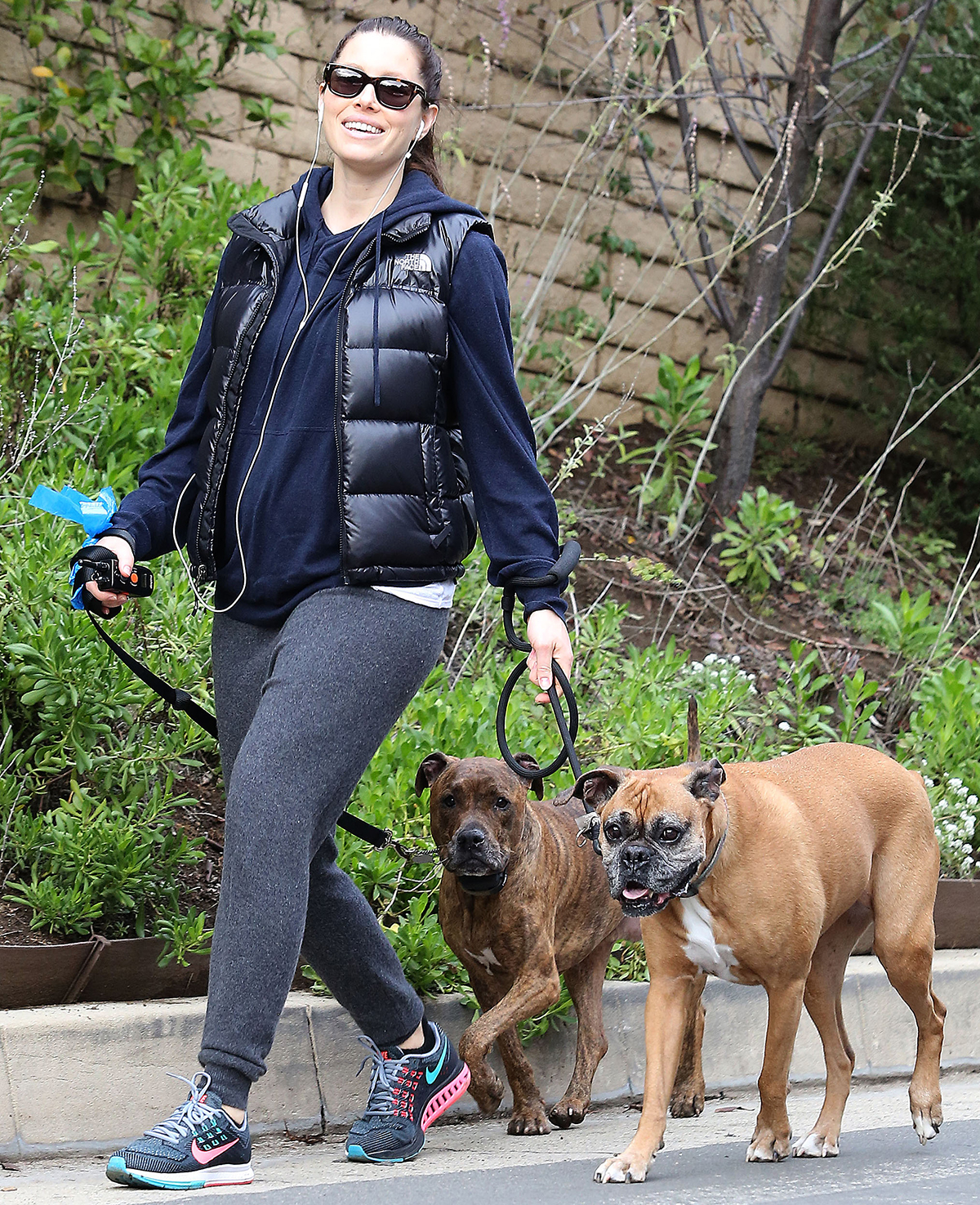 Justin Timberlake's wife has covered up her growing belly since Us broke news of her pregnancy last month, but couldn't hide her new accessory (or her smile!) during the outdoor activity. She kept comfortable in a light navy sweatshirt, black bubble vest, gray sweatpants, and sneakers.