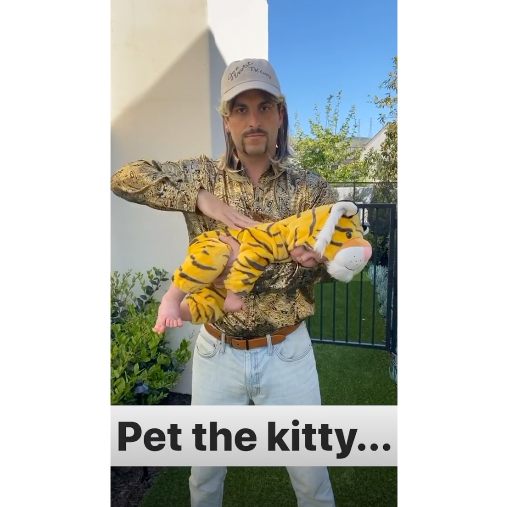 While the Bachelorette alum dressed was Joe Exotic — complete with a wig, patterned top and belted jeans — his wife rocked a long wig and headpiece à la Carole Baskin. Emerson, 2, and Brooks, 8 months, were all smiles in their tiger onesies.