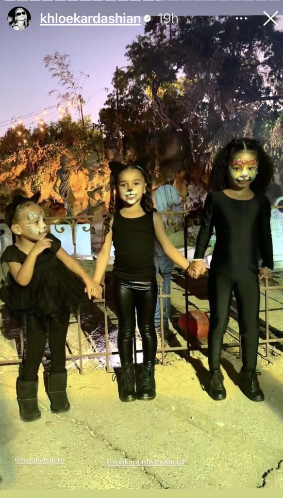 “Me and my girlie kittens,” the Good American cofounder, 38, wrote via her Instagram Story on Thursday, October 27, alongside a video of herself and her 4-year-old daughter showing off their cat face-paint. The pair were joined by 5-year-old Dream — the daughter of Rob Kardashian and ex Blac Chyna — who also rocked a black cat costume on the night out.