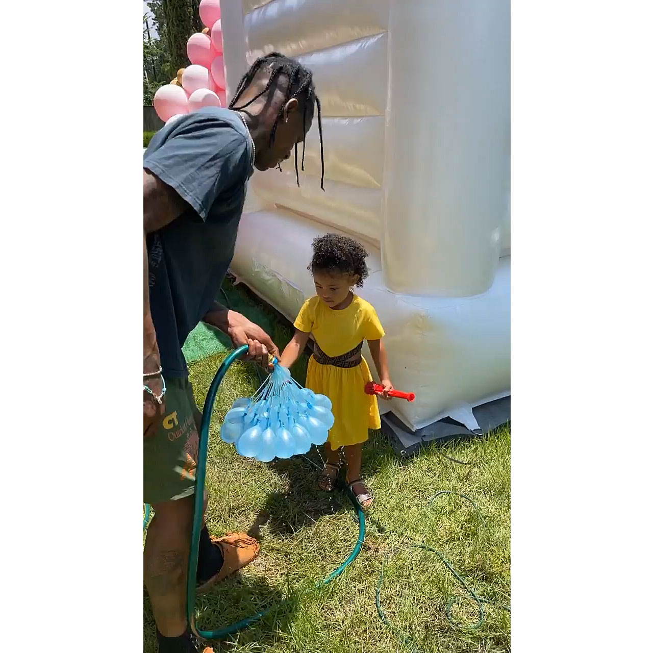 “Love this little baby,” the Keeping Up With the Kardashians star, 23, captioned an Instagram Story video of the toddler walking outside in a yellow dress and matching sandals. In later footage, Scott, 29, filled up multiple water balloons from a hose.