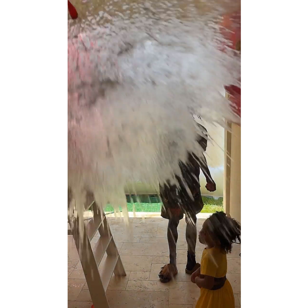 The father-daughter pair continued launching balloons at the Kylie Cosmetics creator through a glass door while she laughed.