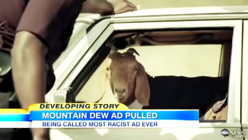 Mountain Dew removed its 2013 ad with Tyler, the Creator after it was criticized for being racially insensitive. The ad stars a goat standing in a police lineup among five black men played by members of rap group Odd Future. A battered and distressed white woman tries to pick out the suspect with the help of a white cop while the goat says things like, “Snitches get stitches.” One social commentator called it “arguably the most racist commercial in history.”