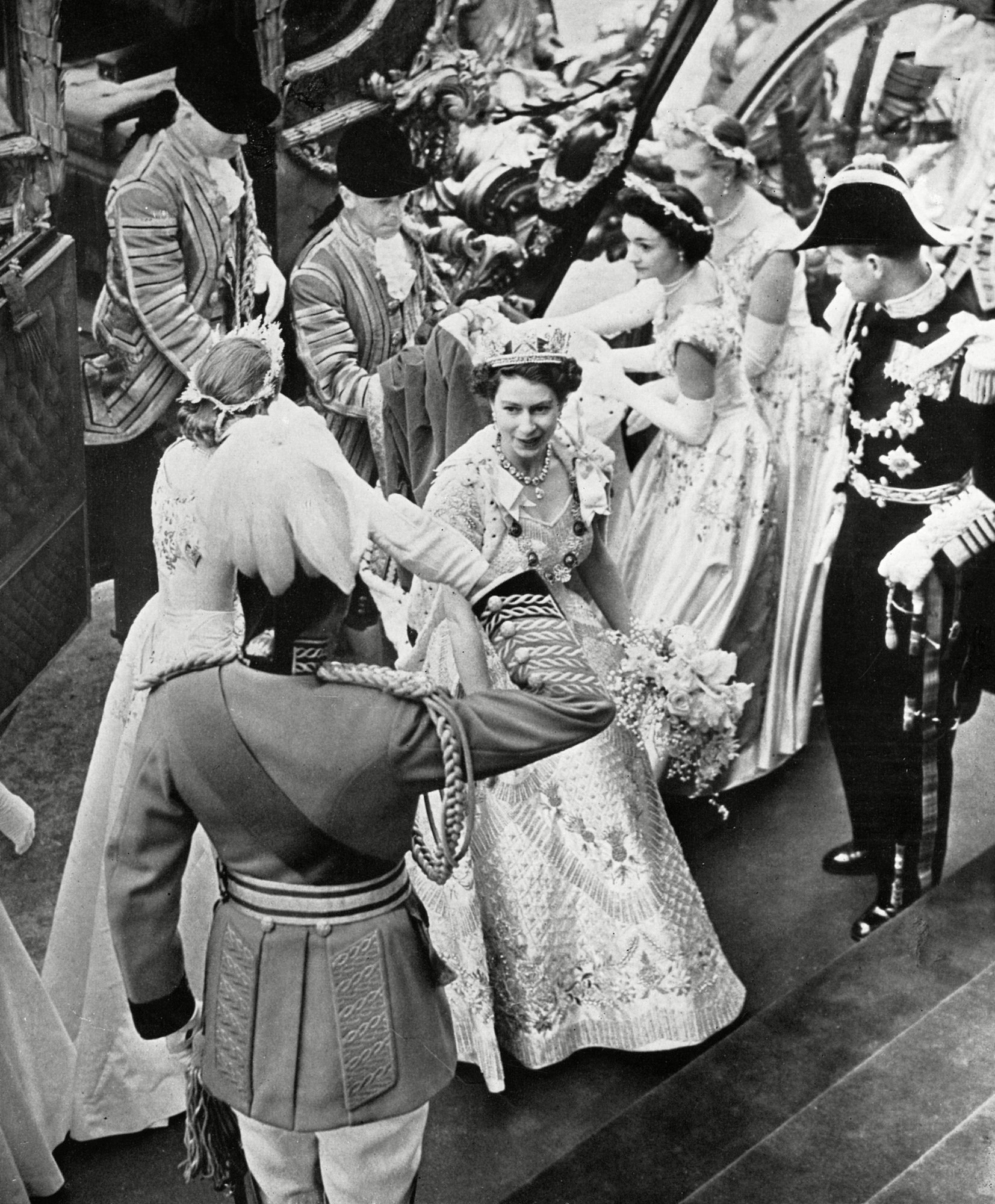 The monarch wore the State Diadem tiara on her way to the coronation, at which she was crowned with the St Edwards Crown. Departing the ceremony, she donned the Imperial State Crown, which features gemstones such as diamonds, rubies, sapphires and pearls. Her dress was designed by Sir Norman Hartnell, and her coronation bouquet, made by Worshipful Company of Gardeners, was comprised of orchids, lilies-of-the-valley, stephanotis and carnations.