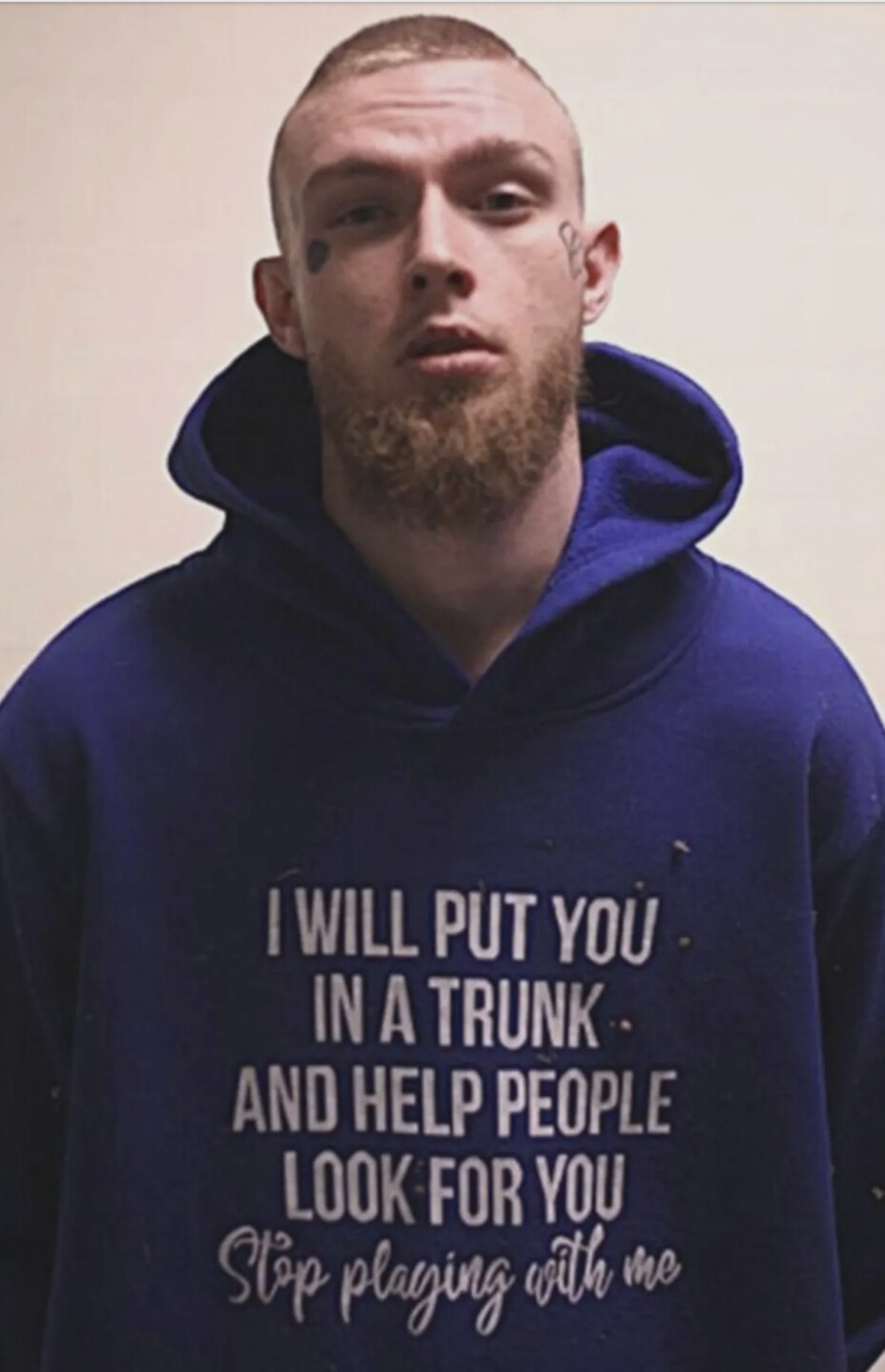 In his booking photo, Wasner was pictured in a blue hoodie that featured a disturbing message in white text. “I will put you in a trunk and help people look for you,” the sweatshirt read, while italic text on the hoodie continued, “Stop playing with me.”