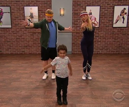 The mom-of-two wore skintight black Lycra for her challenging dance tutorial, keeping her long blonde hair off her face with a cool ’80s sweatband to match show host Corden’s.