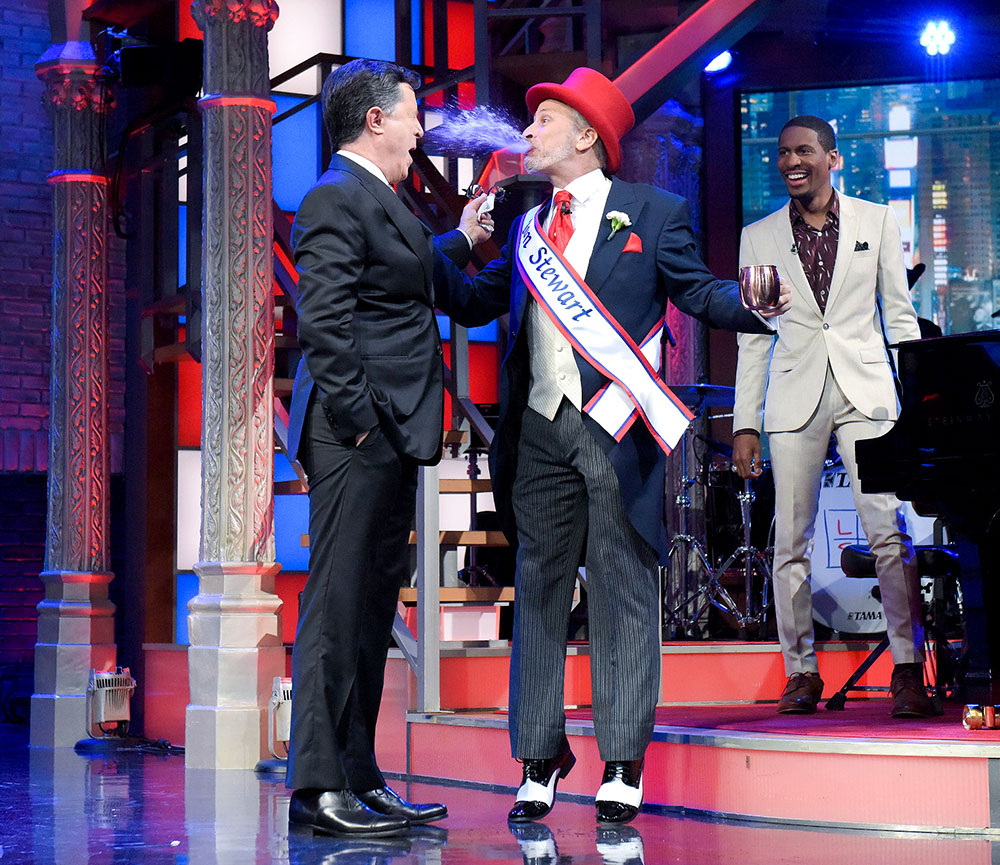 Vote, vote, vote! Jon Stewart and Stephen Colbert reunited during The Late Show on Monday, November 7, to blast Donald Trump one more time before the presidential election.