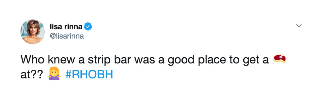 “I was obviously joking about the steak & strip bar,” she tweeted on Wednesday. “I said it in my confessional but never made it in the episode #rhobh.”
