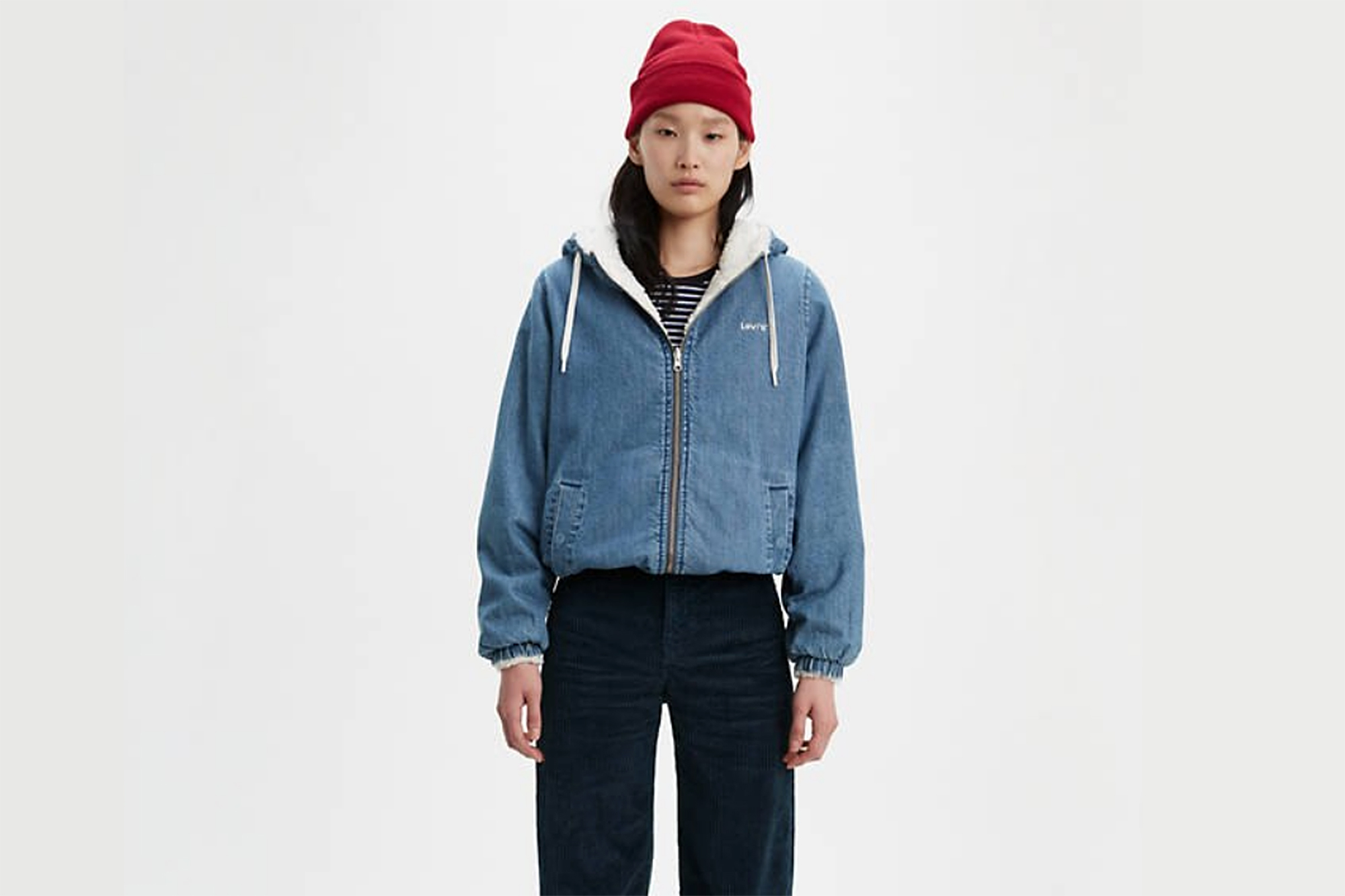 This Levi’s jacket is made of 100% cotton. If we wear it with the denim side out, we’ll find side welt pockets on the sides — and if we reverse it to show off the sherpa, we’ll find on-seam pockets instead. We love how either way we wear it, the other fabric will still peek through as an accent!
