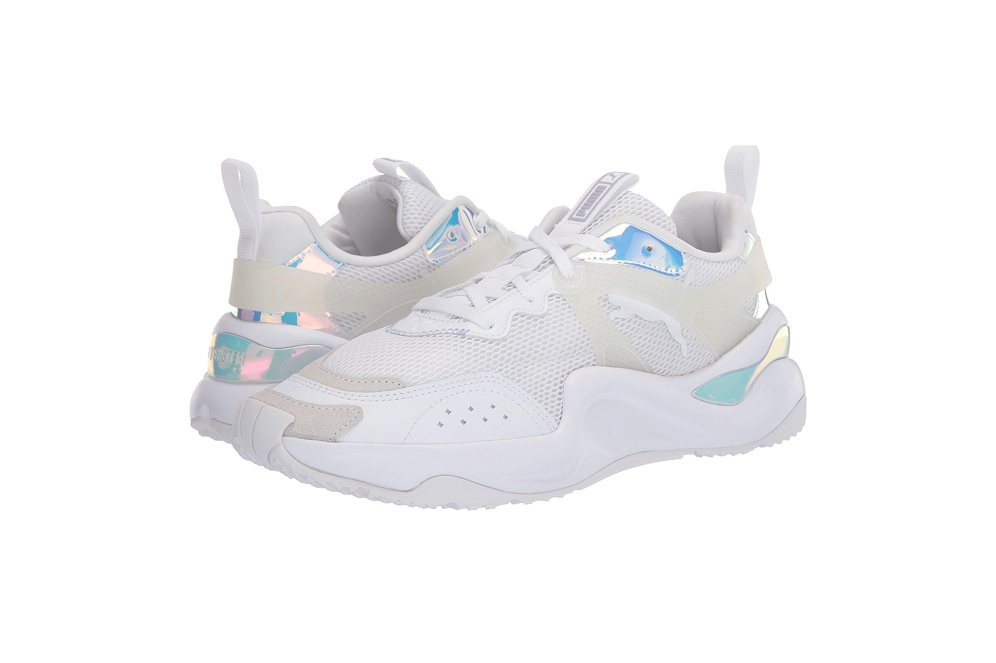 Apart from the iridescent panels, these retro-inspired Pumas have a breathable mesh upper partially wrapped in a translucent rubber caging system. They have a traditional lace-up closure and two pull-tabs — one at the tongue and another at the heel. They even have a padded collar to avoid any semblance of a break-in period!