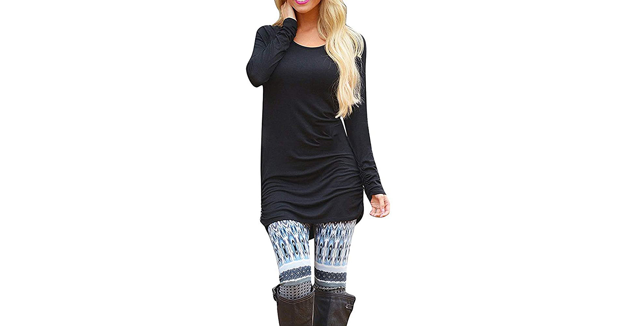 This long-sleeve tunic has a scoop neckline and a hem that hits mid-thigh. Whether the magic really happens though is at the sides of the hips, where you’ll find ruched seams. These seams are like magic. They create a contoured effect for the booty, and the gathered fabric allows for forgiveness over the stomach, relaxing the material so it sits against the skin but doesn’t cling to it. It accentuates your shape without showing every little insecurity. It’s so stretchy too — it’s even recommended for pregnant women!