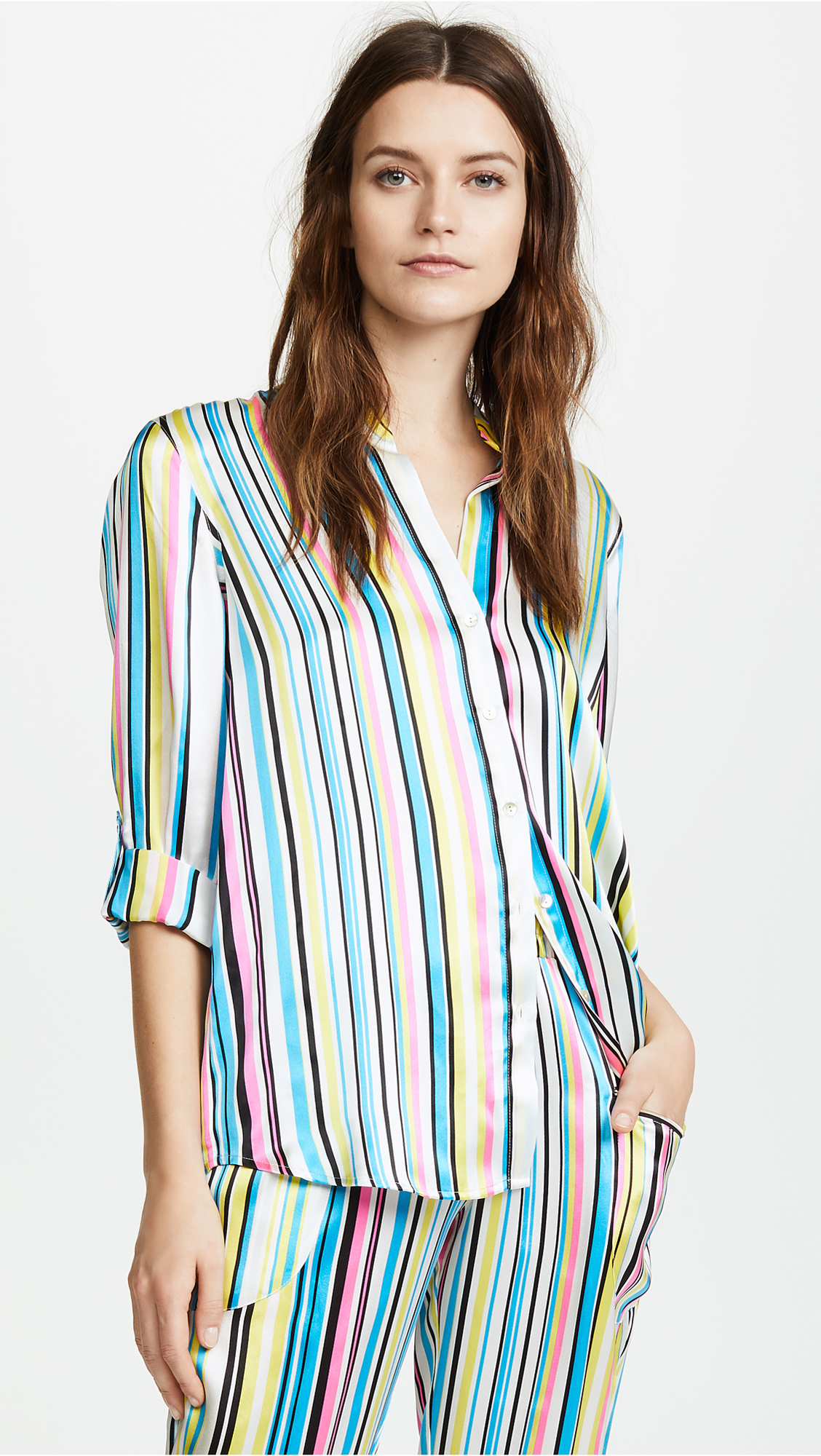 Shop With Us couldn’t help but be inspired by her bright striped blouse! We’ve pulled a few stylish grabs to help give your closet a taste of the rainbow. Grab her exact top or a few close stunners at a lower price point.