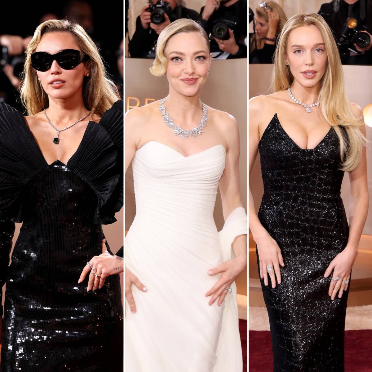 Miley Cyrus opted for Tiffany & Co. accessories at the Golden Globes. She sparkled in a 15-carat emerald necklace, which was strung on a chain of diamonds. She added even more shine to her look with diamond stud earrings and diamond rings on both of her hands.