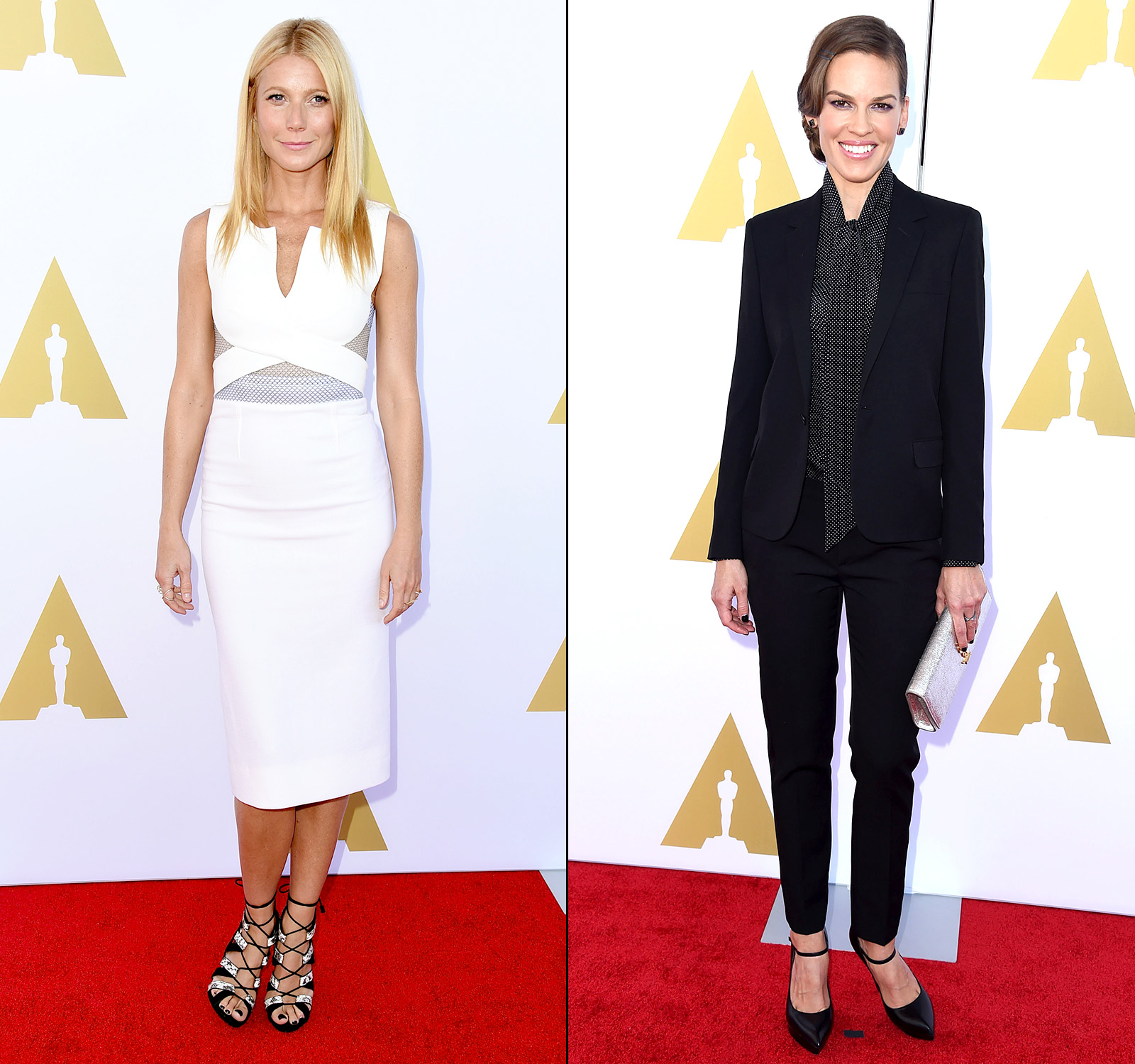In Hollywood, being flexible and style savvy is just a part of the game. Fellow Oscar winners Gwyneth Paltrow and Hilary Swank executed the practice perfectly, doubling up on events on Wednesday, Oct. 8.