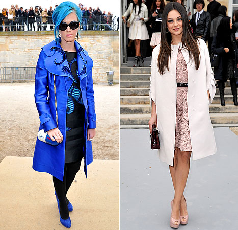 Katy Perry, who hit up several shows, wore her most daring look to the Viktor & Rolf Fall 2012 presentation on Saturday. The blue-haired singer, 26, arrived in the label’s black dress with vibrant blue wave-like detail, a matching coat, coordinating shoes and a Christian Louboutin “Pilule” bag.