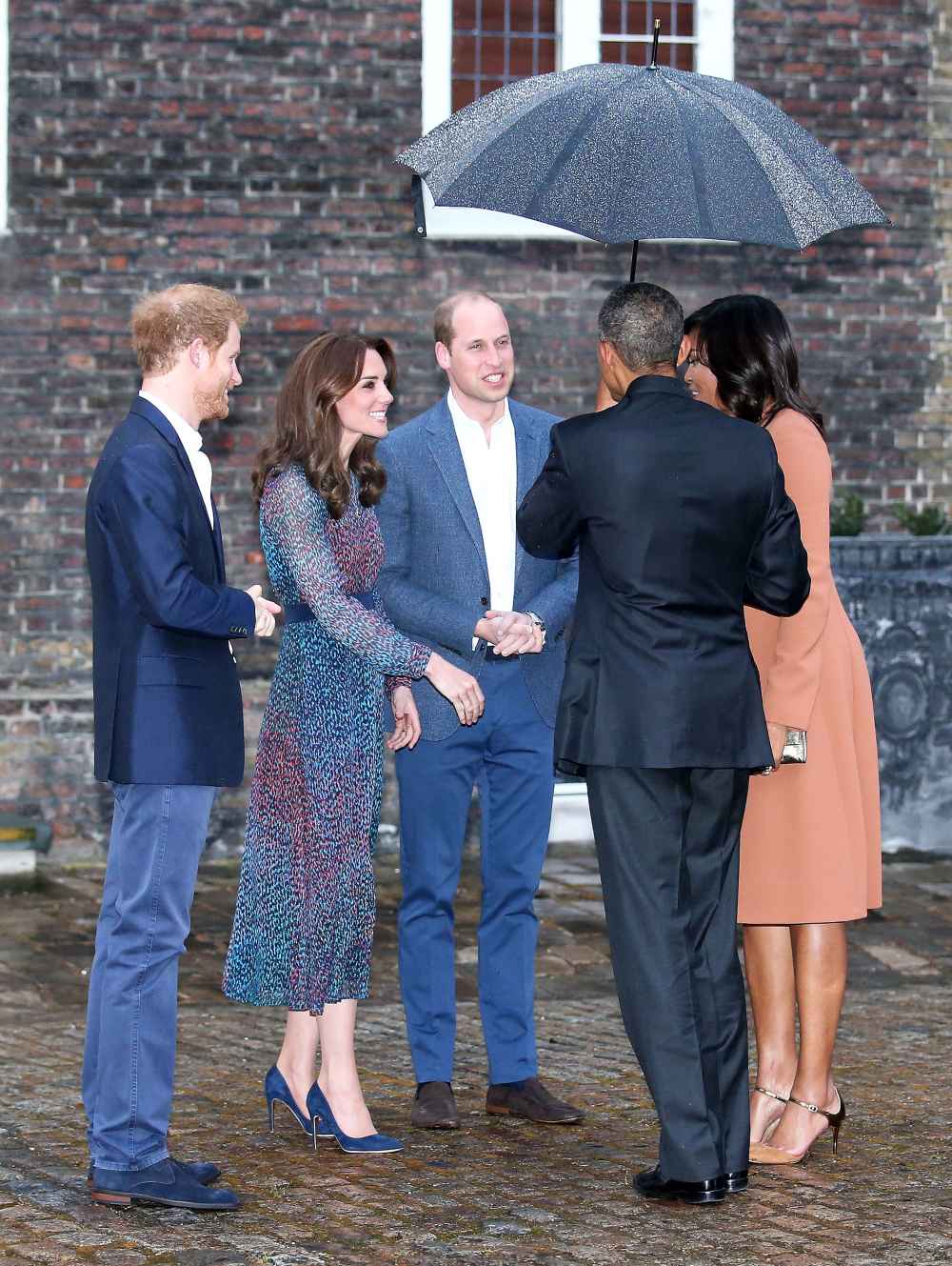 The royals stood on the steps of the palace waiting for the Obamas to arrive. Once they did, Barack called out, “There you are! Hello!” William apologized, “Sorry about the weather. You’ve had a long day,” to which the president replied, “We’ve enjoyed it.” They all shook hands, though Harry, who met Michelle when she visited with her daughters, Malia and Sasha, in 2015, kissed the first lady on both cheeks.