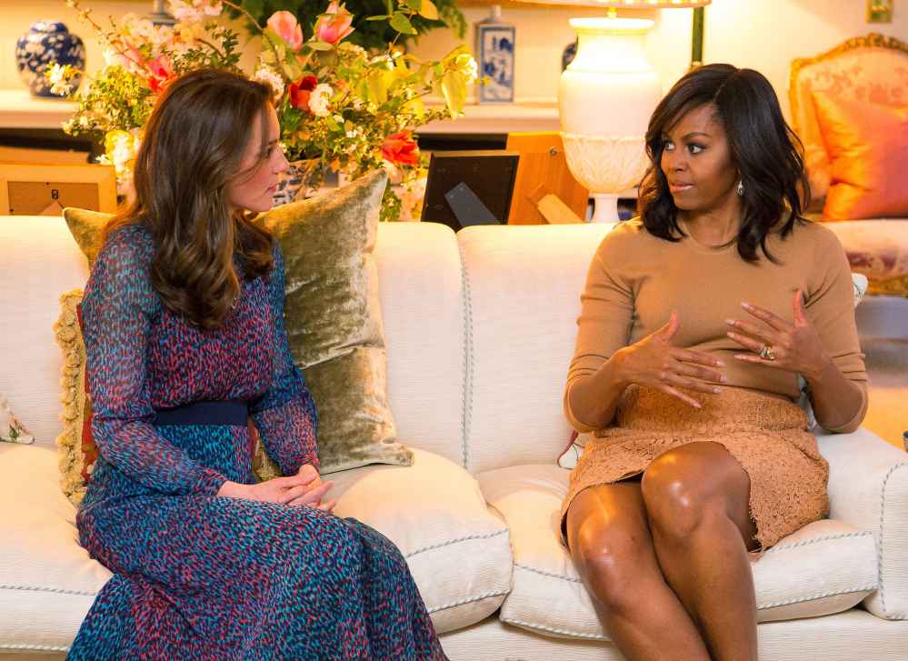 But she wasn’t the only stunner! After meeting with Queen Elizabeth II and Prince Philip earlier in the day, Mrs. Obama, 52, held her own against the trend-setting duchess in a nude top and matching lace skirt, topped off by a terracotta Narciso Rodriguez coat. Suede caramel ankle-strap pumps by Jimmy Choo and a white clutch completed the ensemble.