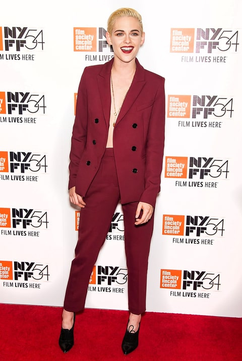 The bold sartorial choice came three days after her appearance at the 2016 New York Film Festival, where Stewart went shirtless in an unbuttoned Sandro suit, offering a flash of her bare chest. She vamped up that style with a matching oxblood statement lip.