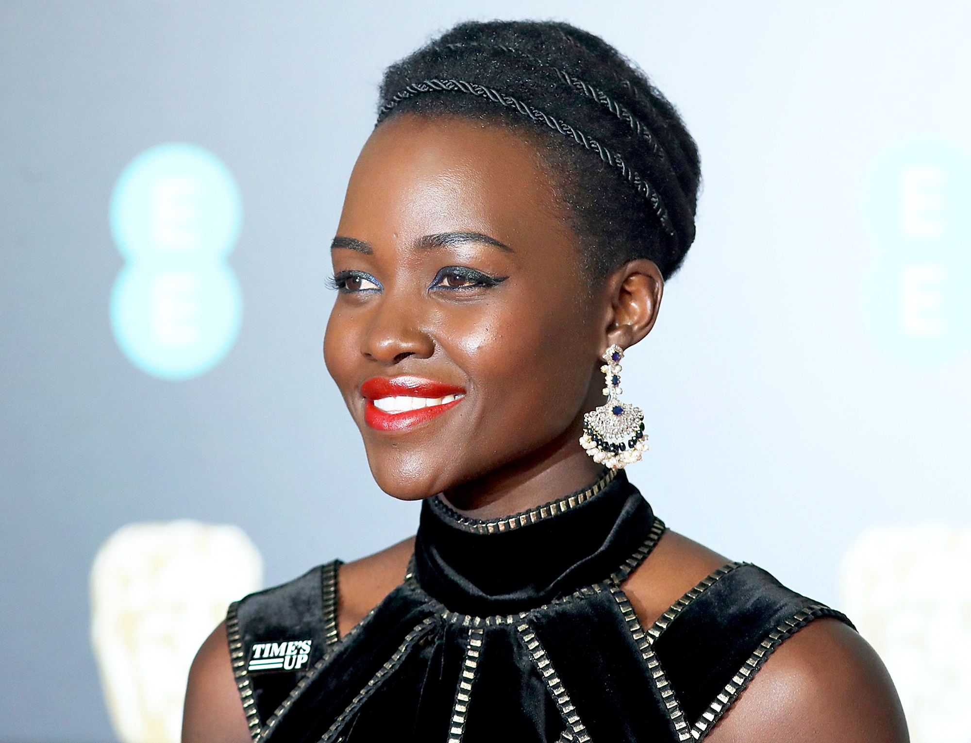 If there was ever a star who consistently inspired Us to go bold with our makeup, it’s Lupita Nyong’o. The Black Panther star consistently rocks bright lips with technicolor lids, all while dressing in one of the most vividly-hued wardrobes in Hollywood. So, naturally, when the stunner stepped out for the 2018 BAFTA Awards in a black Elie Saab gown (to color in honor of Time’s Up) she complemented the gorgeous gown with a blue winged eye and persimmon red lip courtesy of celebrity makeup artist Nick Barose.