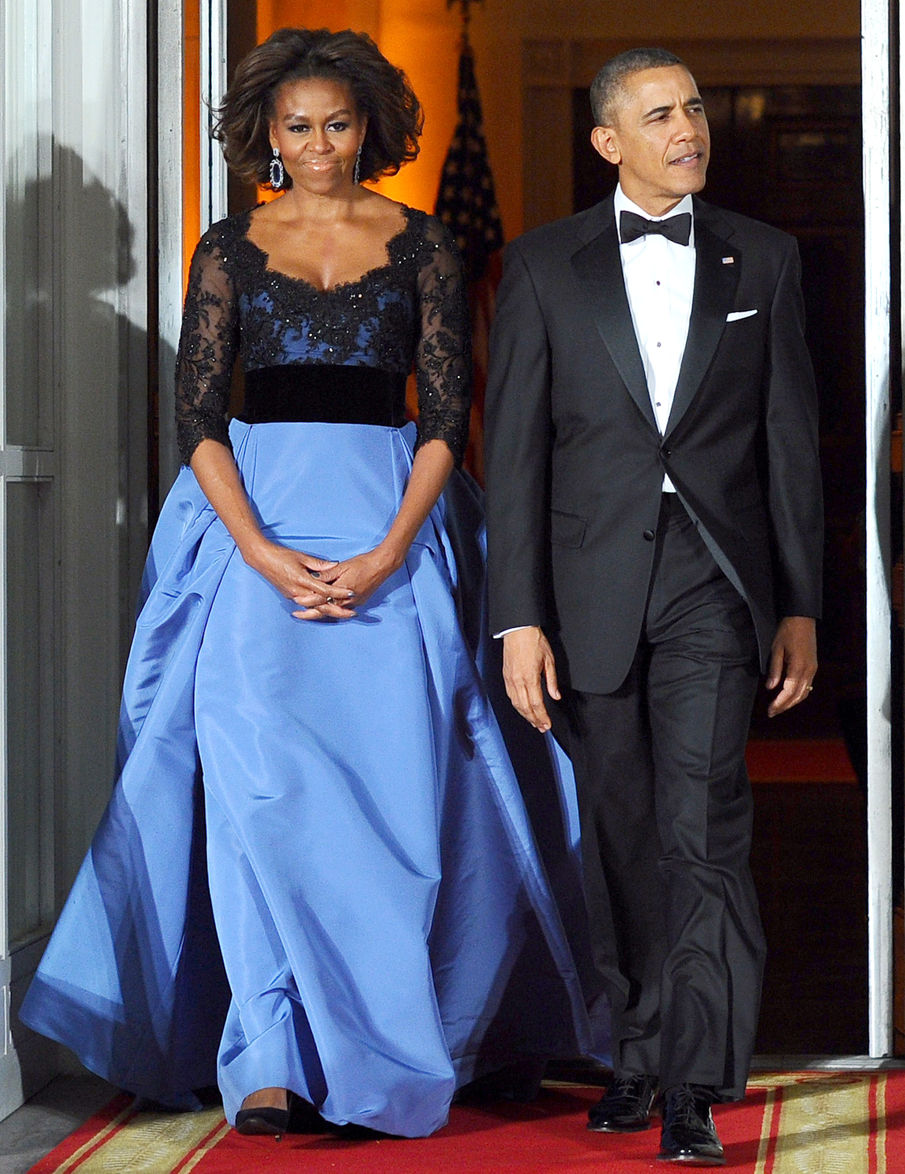 Mrs. Obama, 50, selected a dress by Venezuelan-American designer Carolina Herrera for the occasion. The gown featured a low-cut black lace top with three-quarter sleeves, a silk faille inverted pleat skirt in a liberty blue color and black velvet belt. To accessorize the look, Obama wore large dangling earrings, glam eye makeup and styled her shoulder-length hair straight with extra volume. Herrera confirmed to CBS News that she made the dress at her New York Atelier.