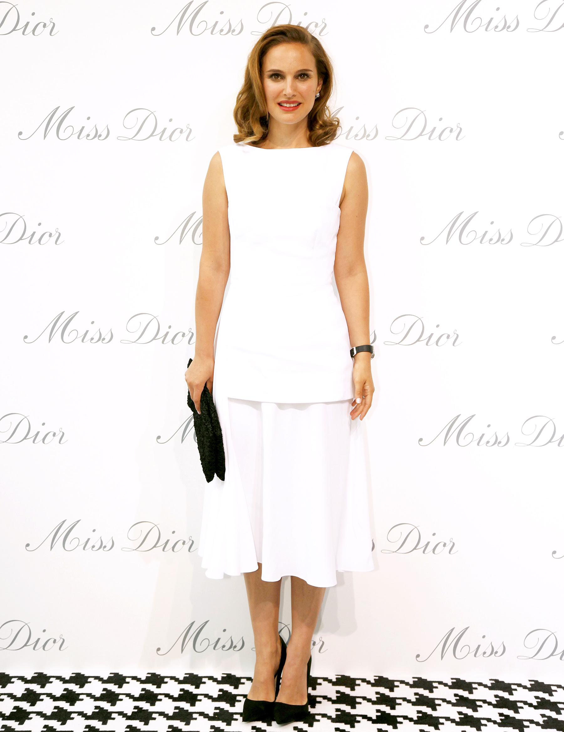 Portman, who's fronted the French fashion house's Miss Dior Cherie fragrance since 2010, accompanied her new hair hue with a soft ladylike ensemble. Portman wore a white silk dress by Dior featuring a cotton basque. The Black Swan star paired her outfit with black pumps, a matching clutch, and white gold and diamond earrings by the same designer.