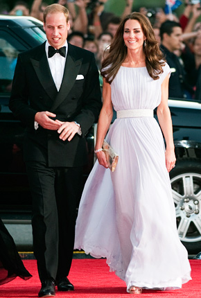 With a tuxedo-clad Prince William at her side for BAFTA's Brits to Watch 2011 gala, the 29-year-old royal wore a floor-length pleated lilac chiffon gown by Alexander McQueen and earrings lent to her by Queen Elizabeth; the rest of her jewelry for the night was her own. For footwear, the Duchess chose sandals by Jimmy Choo, and carried an "Ubai" bag by the same designer.