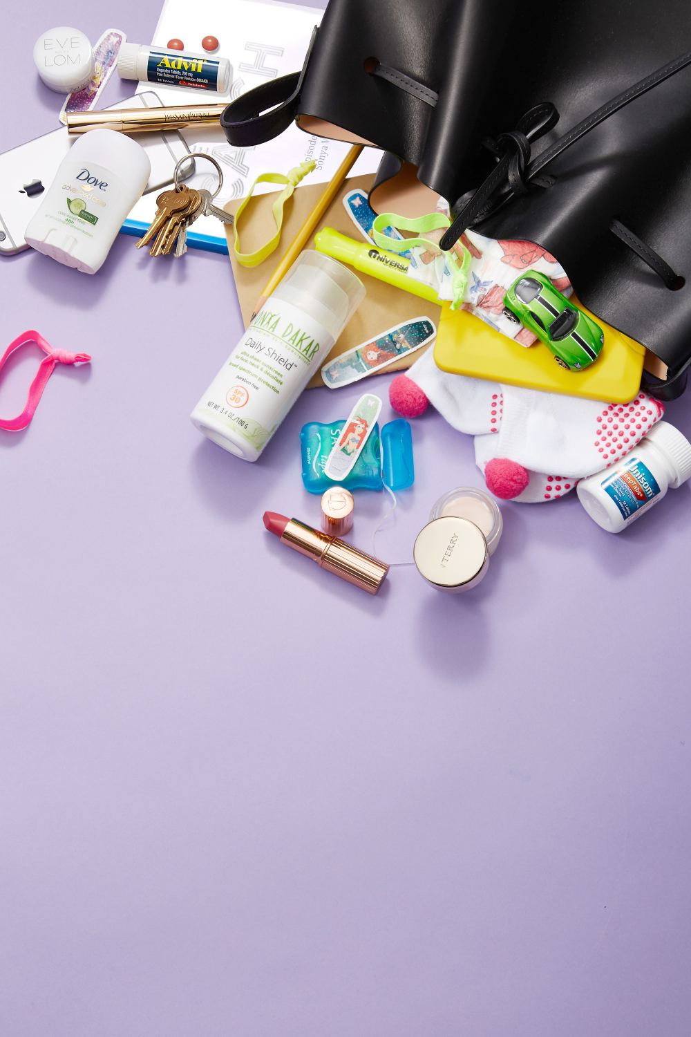 Also in Sonya’s bag: Yves St. Laurent Touche Eclat, Sonya Dakar SPF 30, dental floss, neon no-tug hair ties, a size 4 diaper, Advil, a Moleskine journal, pilates socks, an iPhone 6, a Kindle, a yellow highlighter pen, Dove travel-size deodorant and her script for The Catch.