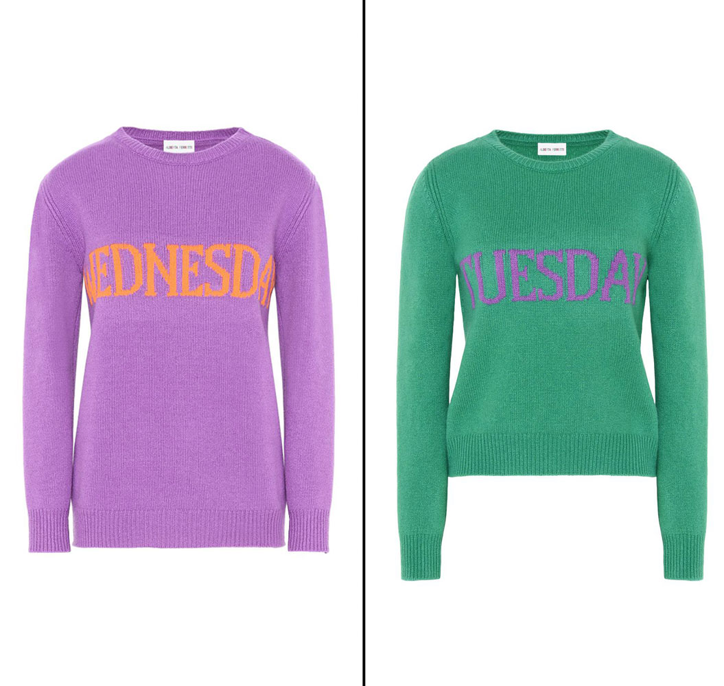 Take the guesswork out of getting dressed in the morning with Alberta Ferretti’s Rainbow Week sweaters. The wool and cashmere toppers — beloved by Diane Kruger and Alessandra Ambrosio — come in seven different hues featuring a day of the week across the chest. See how the stars wear the jumper, then find out where to buy one for yourself!