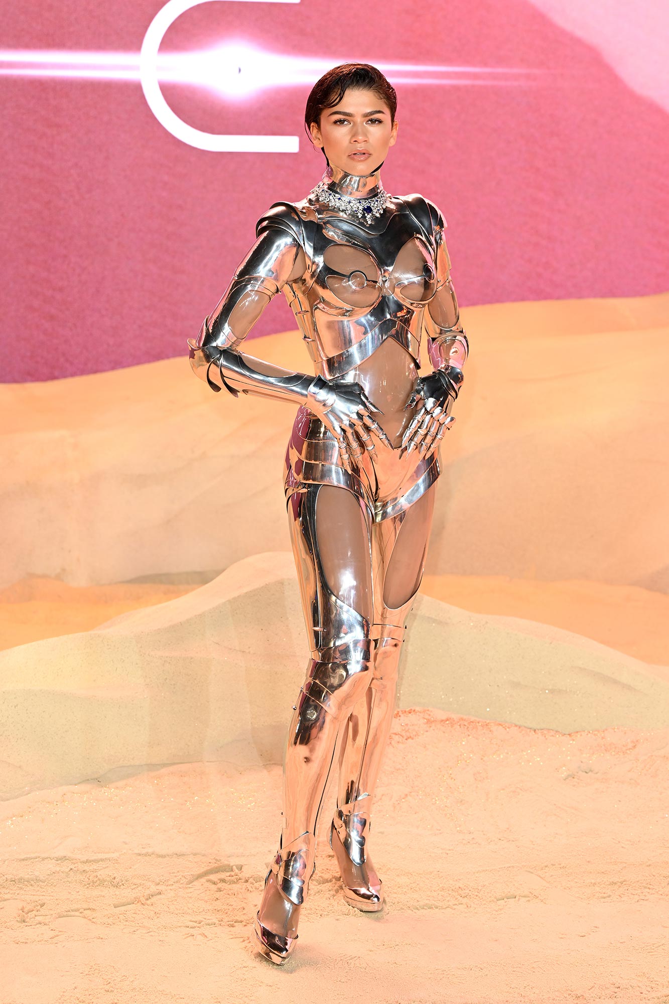The 27-year-old actress graced the Thursday, February 15, red carpet in a cyborg-inspired catsuit from Mugler. First seen on the fashion house’s haute couture fall/winter 1995 runway, the one-piece features a completely transparent breastplate, armor-like shoulder pads and robotic chaps that fell into pointed-toe pumps. Zendaya went topless underneath the intricate design and accessorized with Bulgari jewelry.