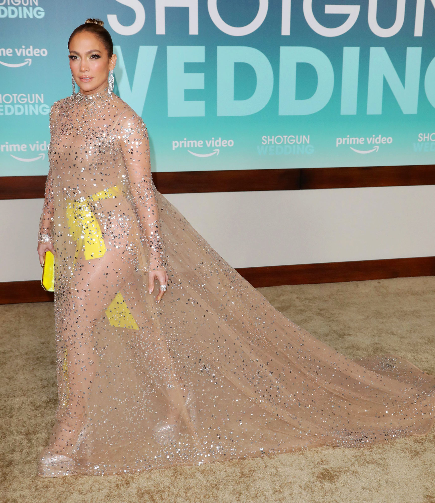 For the red carpet soirée in Los Angeles, Lopez, 53, stepped out in a sparkly creation by Valentino. The gown — which first debuted on the runway of the label’s fall 2022 couture show — featured completely sheer, sequin-covered fabric that was equipped with sleeves and a loose-fitting skirt. Underneath, the “Get Right” artist donned a beige bodysuit that was teamed with a yellow bow at the waist.
