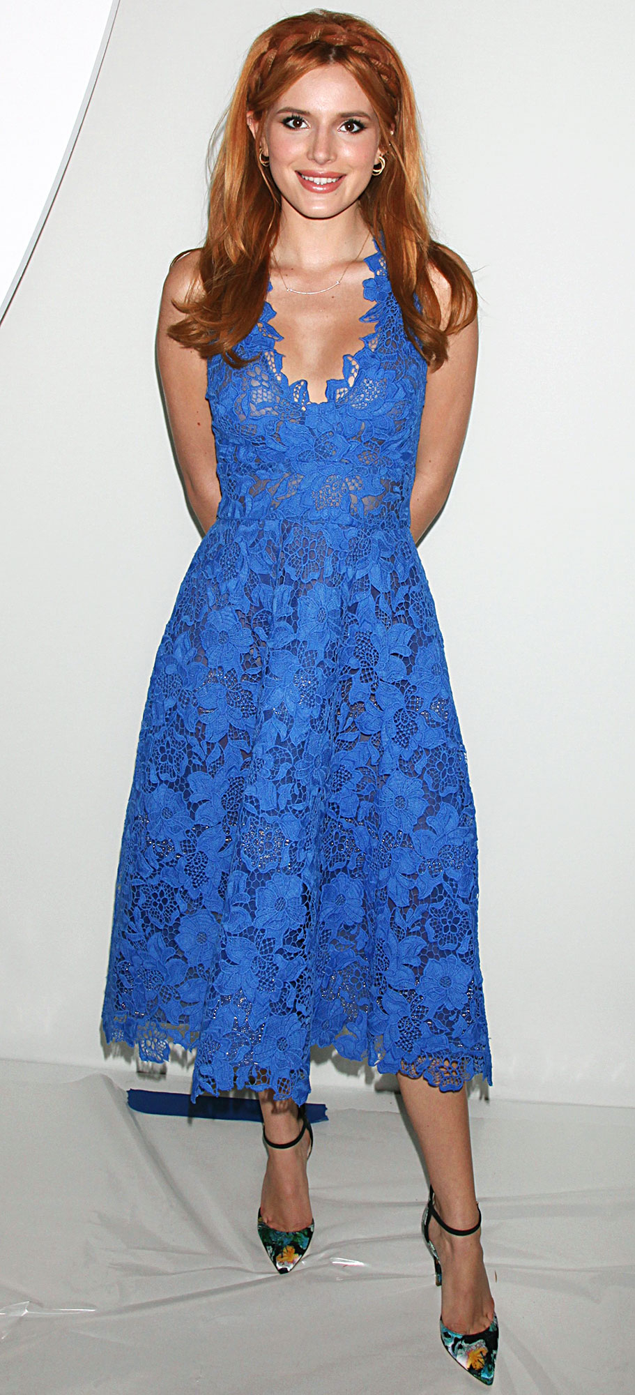 Last September, she had the blues in a Monique Lhuillier silk Tea Length Dress. ($989 on sale, moniquelhuillier.com)