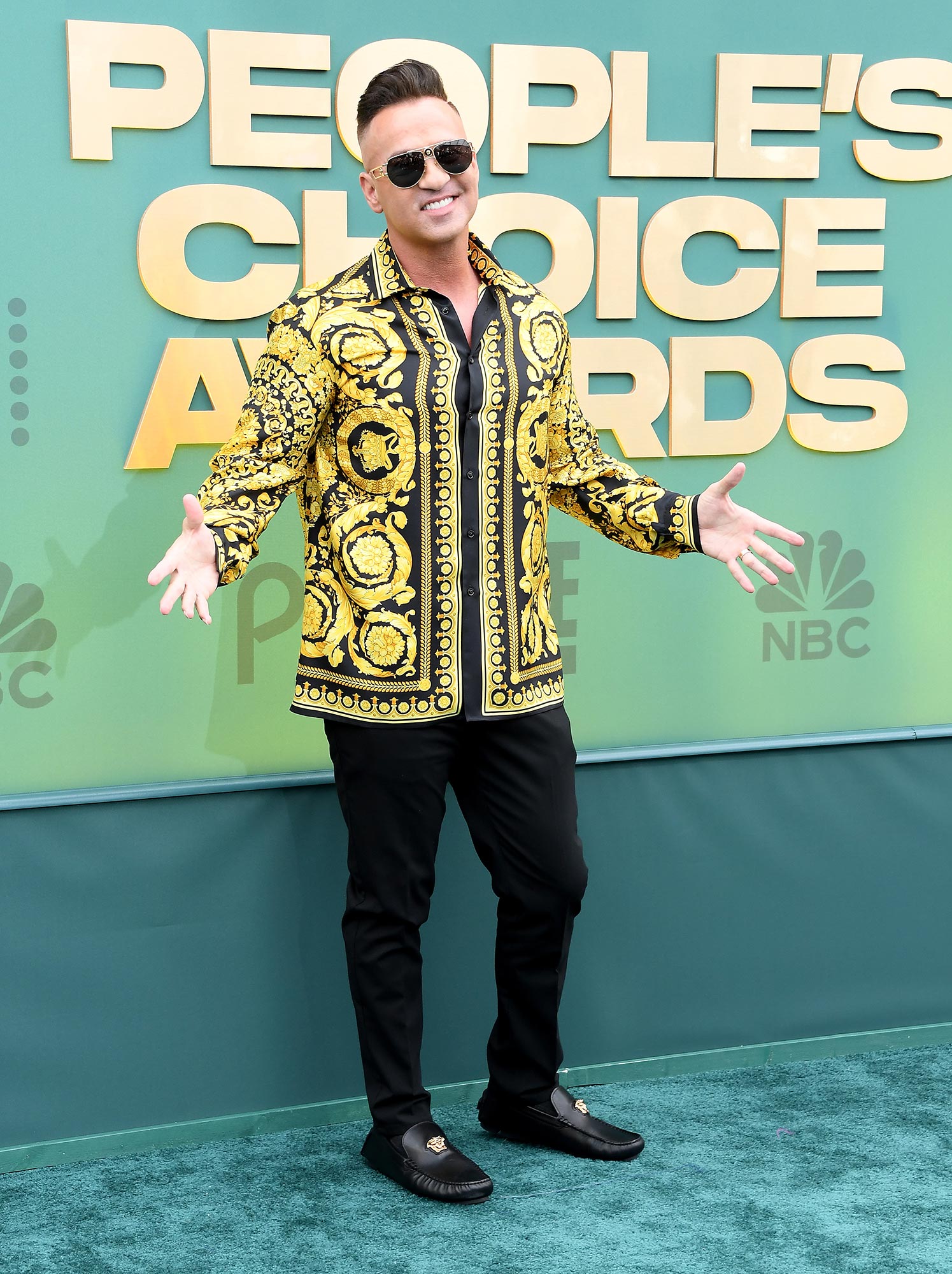 Jersey Shore’s Mike Sorrentino added a splash of color to the red carpet in a loudly patterned gold and black button down shirt, which he paired with black trousers and black loafers.